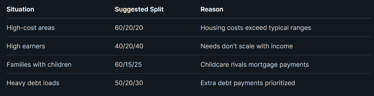 Sometimes, your life just doesn't fit the standard 50/30/20 mold. Where you live, your family size, or your debt load might call for a different split.