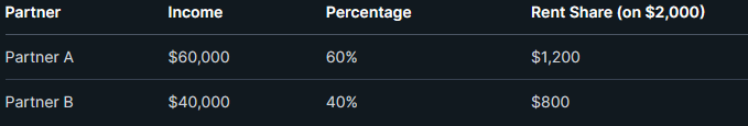 Say Partner A makes $60k, Partner B makes $40k. Total: $100k. So A pays 60%, B pays 40% of shared stuff.