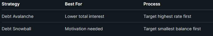 If you need more motivation, the debt snowball works too. Knock out your smallest debts first for quick wins, even if it costs a bit more in interest.