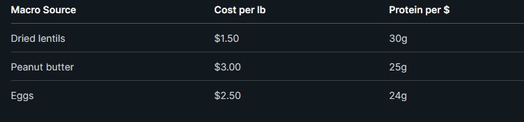 Dried beans and lentils give you the best protein-to-cost ratio at $1.50 per pound dry. That's 3-4 cooked cups, and each half-cup has 15g protein.